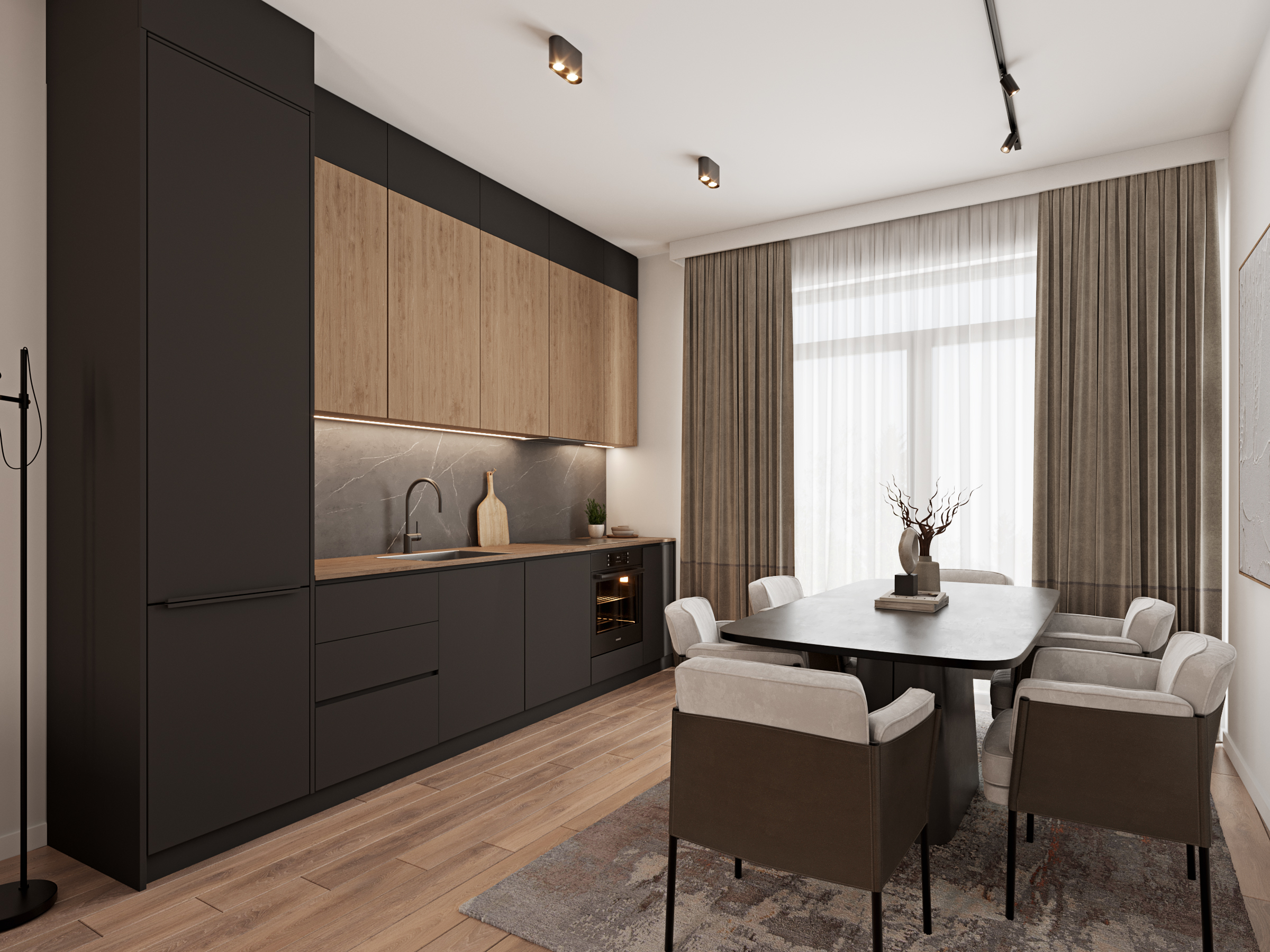 – Moderne open keuken: Compleet met inductiekookplaat, afzuigsysteem, combi-oven, vaatwasser en koelkast met vriesvak.