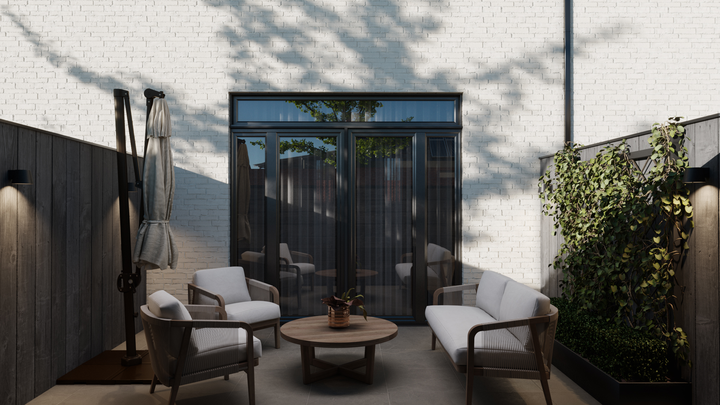 – Onderhoudsarme Tuin: Ideaal om te genieten van zonnige dagen, inclusief antraciet tegels (80×80 cm) en een composiet schutting.